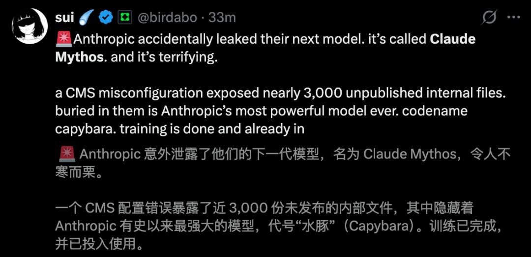 Claude Mythos代号「Capybara」,代表最高「层级」,是一款具有划时代意义的全新模型。