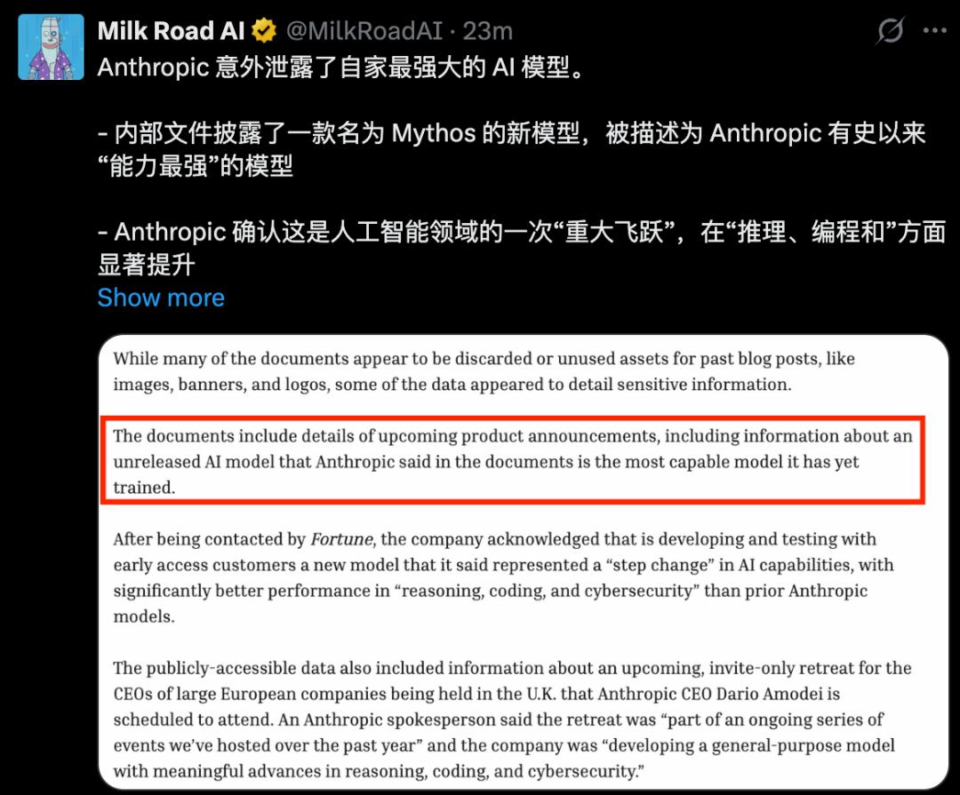 由于一次罕见的「人为配置」错误,最强大模型「Claude Mythos」绝密细节公之于众。