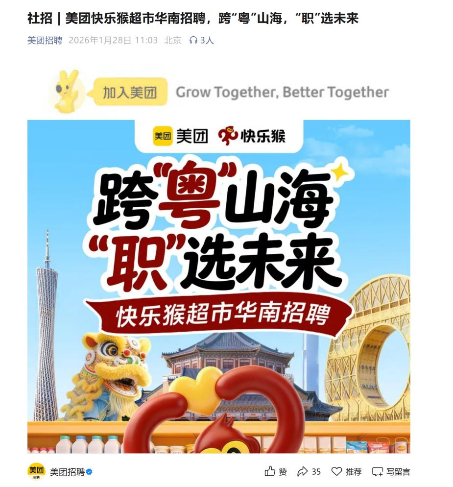 值得注意的是,快乐猴也在加速布局华南市场。据美团招聘官方公众号显示,美团快乐猴超市于1月28日开启华南市场招聘,覆盖门店拓展、门店运营、业务开发、商品采购、供应链五大板块,具体岗位包括选址拓展经理、店长、水果采购专家、3R采购专家等。