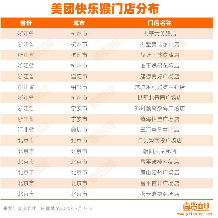 3月27日,美团快乐猴一日之内连开三店,分别位于浙江省宁波市的鄞州颐高数码广场、宁波市镇海招宝广场,以及北京市密云瑞嘉商场,这也意味着美团快乐猴正式进入宁波市场。