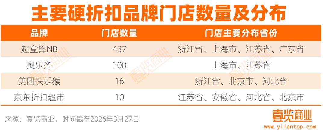 据壹览商业不完全统计,截至2026年3月27日,奥乐齐在全国设有100家门店,超盒算NB共有437家门店,京东折扣超市有10家门店。