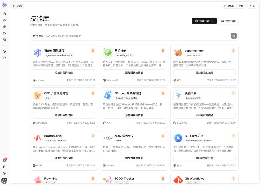 用户可以在数字员工市场中直接雇佣已经训练好的调研分析、数据处理、内容生成、会议洞察、设计处理等等专家级Agent。而这些Agent给用户最终交付的是结果,不是半成品。