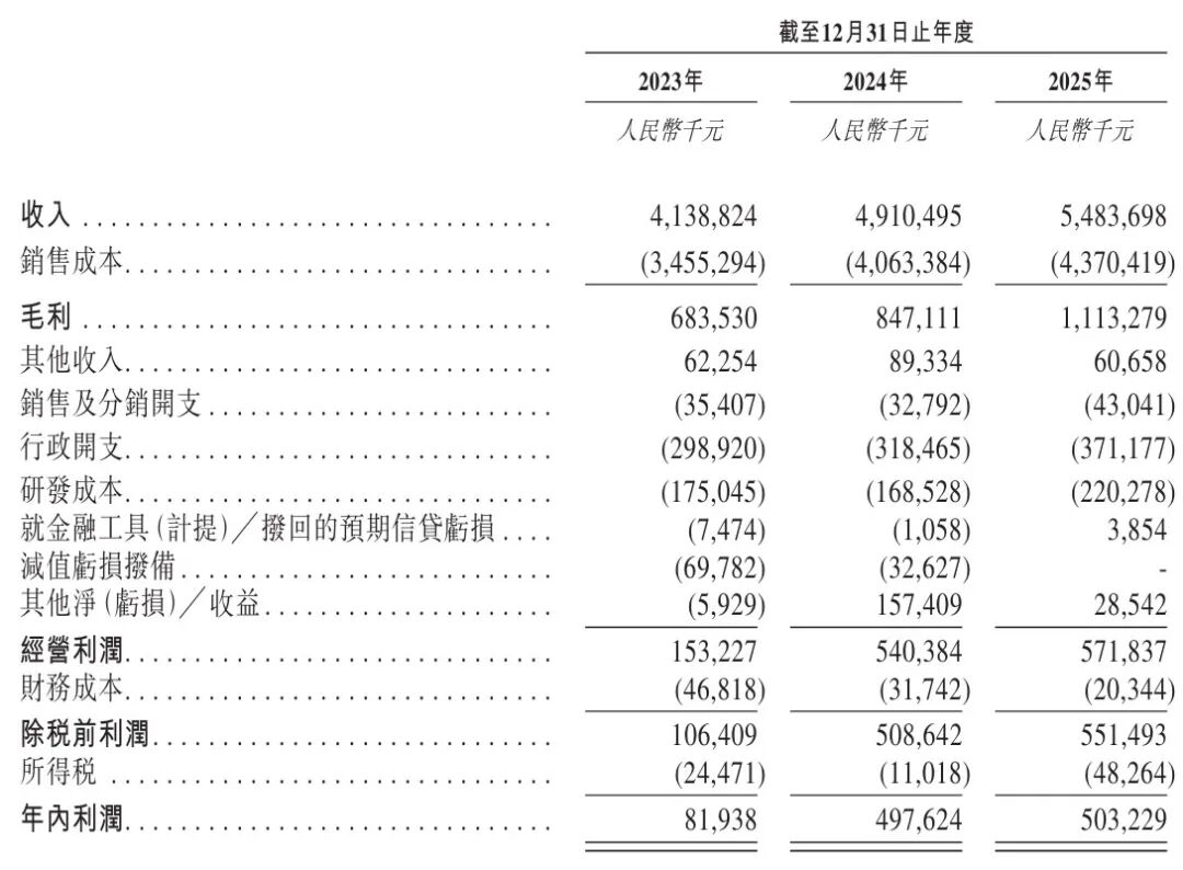 招股书显示,双林股份2023年、2024年、2025年营收分别为41.39亿元、49.1亿元、54.84亿元;毛利分别为6.84亿元、8.47亿元、11.13亿元;期内利润分别为8194万元、5亿元、5亿元。