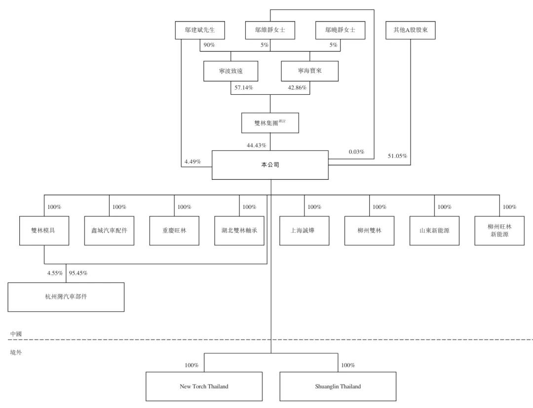 IPO前,双林集团直接持有双林股份已发行股本总额的44.43%。双林集团由宁波致远及宁海宝来分别持有57.14%及42.86%。