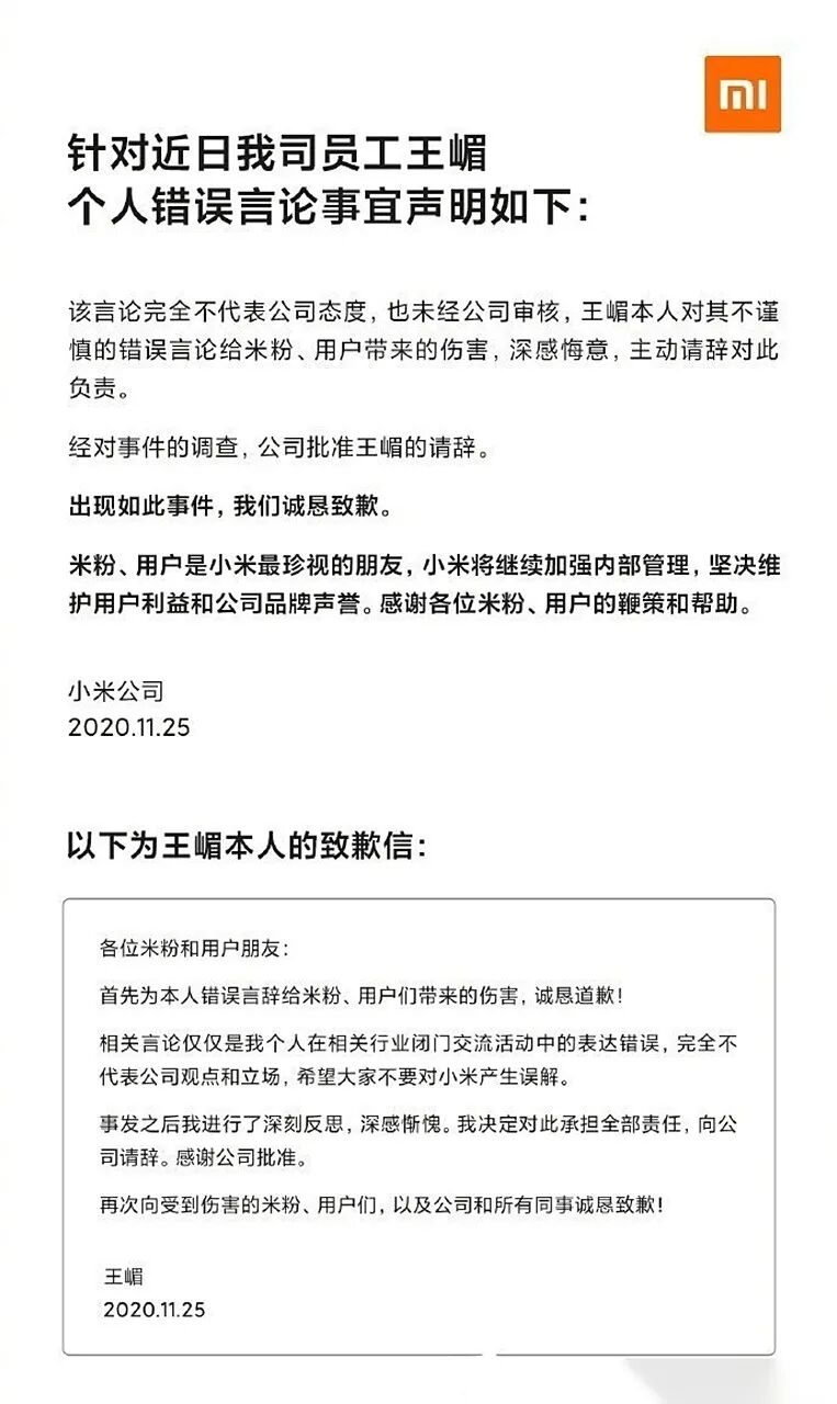 小米官方道歉,当事人引咎辞职。