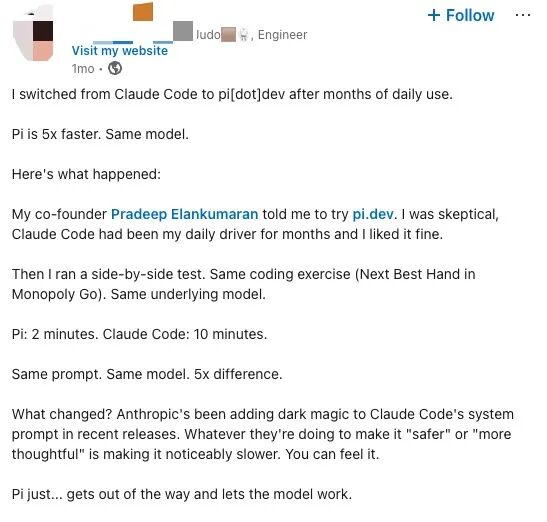 网友评价:同一个编程任务,同一个模型。Pi:2 分钟,Claude Code:10 分钟