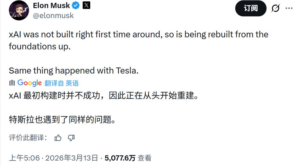 马斯克3月曾发布推文,将xAI的问题摆到台面上,他称:“xAI最初没走对路子,如今正从头开始重建。特斯拉当年也是这么过来的。”