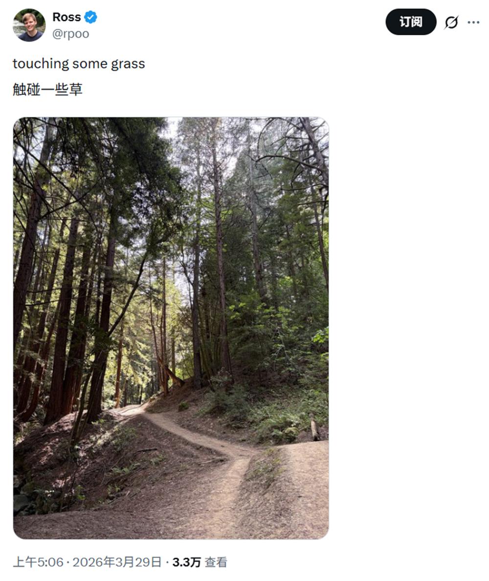 与其他xAI联合创始人离职时不同,诺丁此番离开既无公开信,也无任何正式声明。他倒是在4小时前发布了一张林间徒步的照片。对一家以“硬核”工作节奏闻名的AI公司而言,这样的闲适本身可能就意味着一种告别。