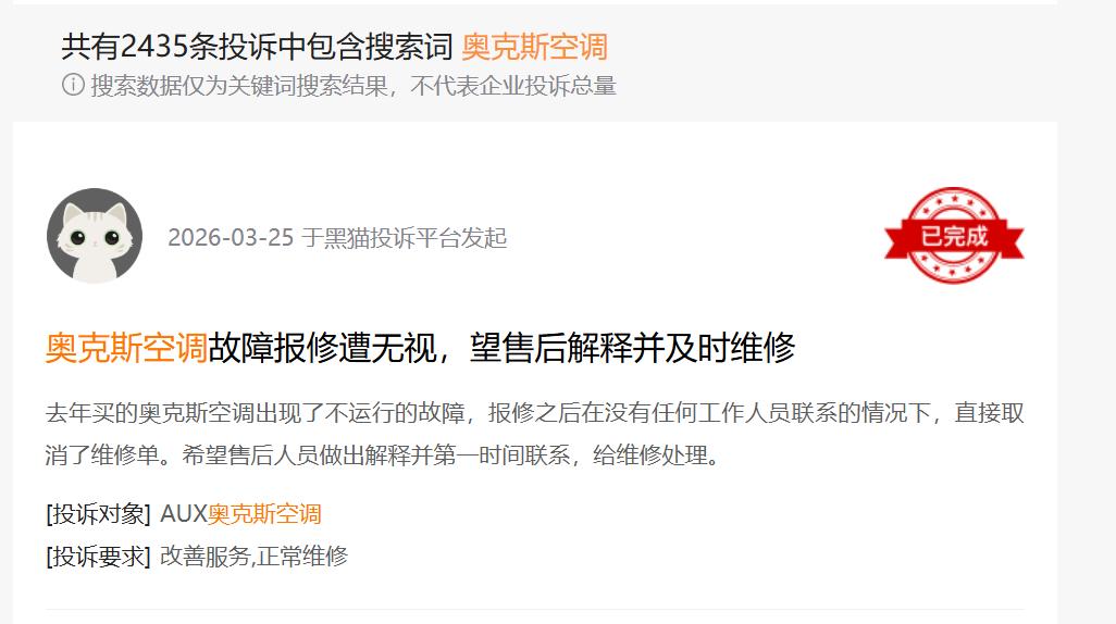 在黑猫投诉平台上搜索“奥克斯空调”,更有超过2400条投诉,主要涉及空调容易坏、制热制冷效果不好、售后服务差等方面。