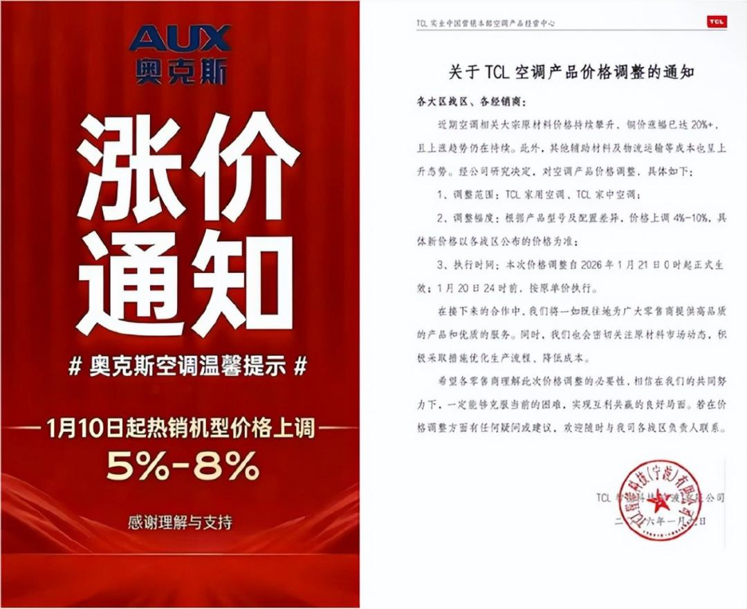事实上,受到以铜为代表的原材料价格上涨压力,包括海信、美博、志高、TCL等多家空调企业,已从去年12月开始陆续向代理商下发调价通知,涨价幅度在3%-10%不等。