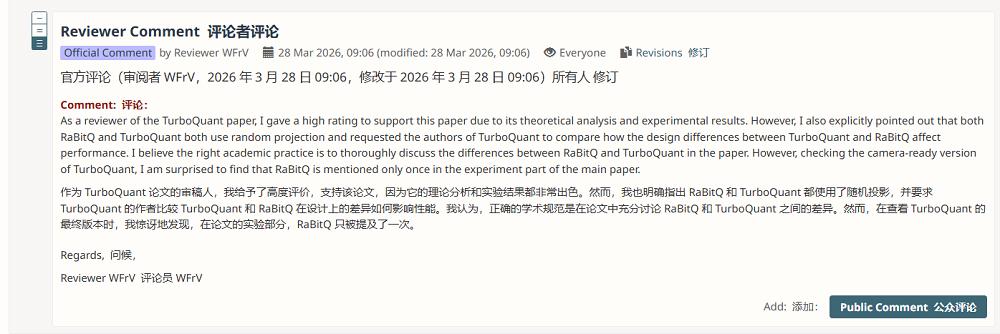 TurboQuant论文的一位评审者在公开的学术论文评审平台OpenReview发表评论,称他虽然认为TurboQuant的理论分析和实验结果都很出色,但是也发现这一方法与RaBitQ存在明显的共通之处,并要求TurboQuant团队比较两者在设计上的差异如何影响性能。