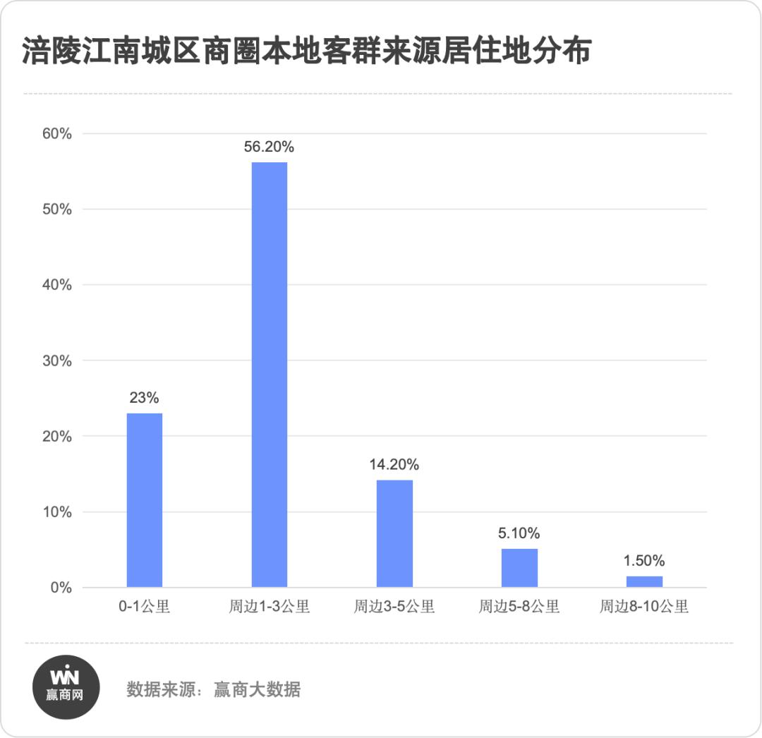 赢商大数据显示,江南城区商圈主要辐射1-3公里圈层,该范围内人口占比56.2%,社区属性突出;3-5公里占比14.2%,更远距离仅占6.6%。