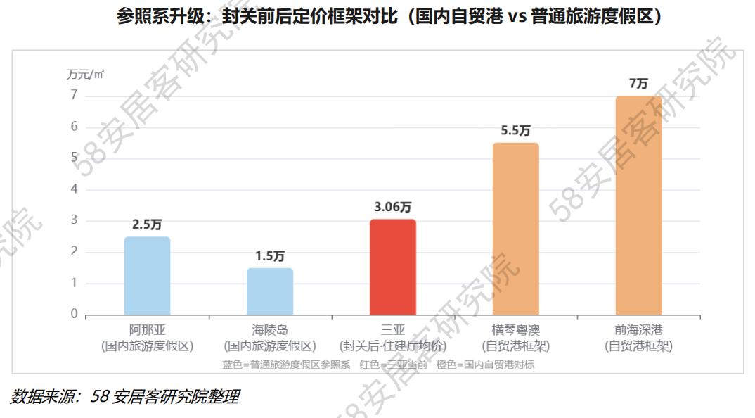封关前,买家拿三亚跟海陵岛、阿那亚、太湖别墅比——这些地方在制度属性上没有本质区别,都是中国大陆监管范畴内的旅游度假区,这套参照系决定了三亚高端住宅的隐性价格天花板,大致在3-4万/㎡。封关后,买家的估值框架开始引入"制度属性价值"这个维度——国内同为自贸港框架的横琴粤澳深度合作区高端住宅均价已突破5-6万/㎡,前海深港合作区的高端商务住宅均价更高。三亚当前3-5万/㎡,在自贸港资产的估值框架里,并不显得高估。