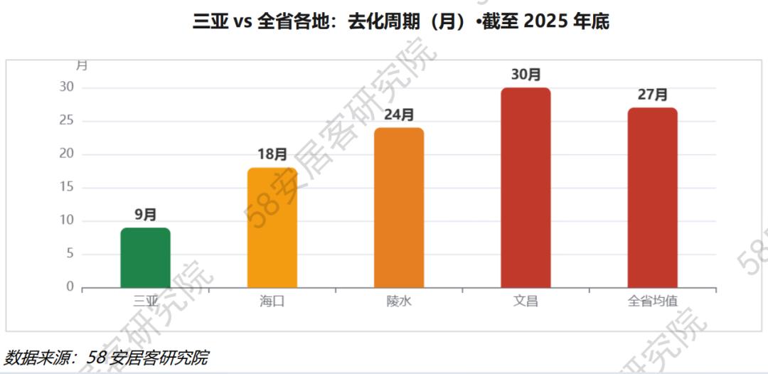 截至2025年底,三亚商品住宅库存约121万㎡,对应去化周期仅约9个月——全省平均去化周期27个月,三亚不到均值三分之一。12个月以内是行业内"健康偏紧"区间,开发商无降价去库存的压力。