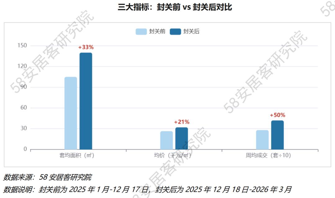 2025年封关前(1月至12月17日),三亚新房周均成交套均面积约105㎡;封关后(2025年12月18日至2026年3月),这个数字跳升至约140㎡,涨幅明显。