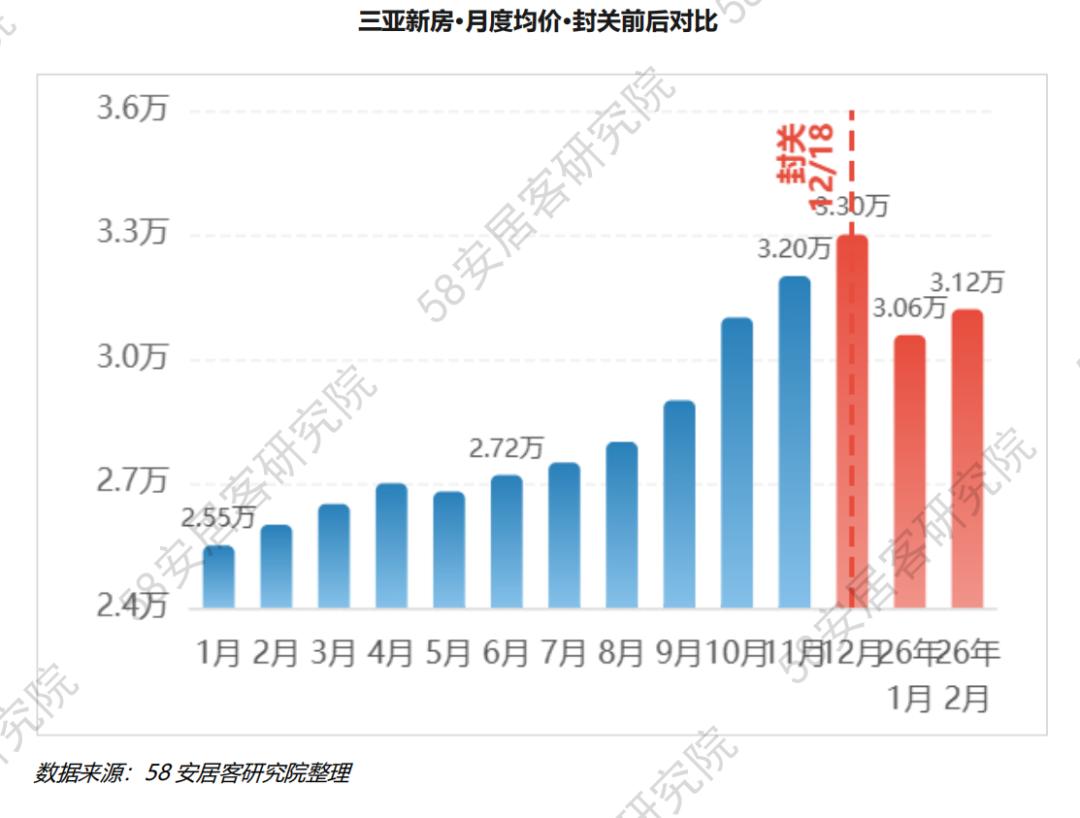 2025年上半年(1月-6月),三亚新房成交均价在2.5-2.7万/㎡区间波动(封关前正常中枢)。封关后,均价已跳升至3万/㎡以上,2026年1月官方网签均价为30579元/㎡。