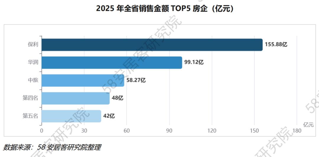 2025年全省住宅销售榜,前三名无一例外全是央国企:保利155.88亿(第1)、华润99.12亿(第2)、中旅58.27亿(第3),三者合计约313亿,约占三亚住宅年度总成交额的60%。这不是偶然,而是2021年以来民营房企陆续出清、央国企补位深耕的历史结果。