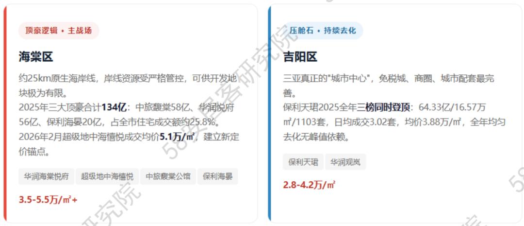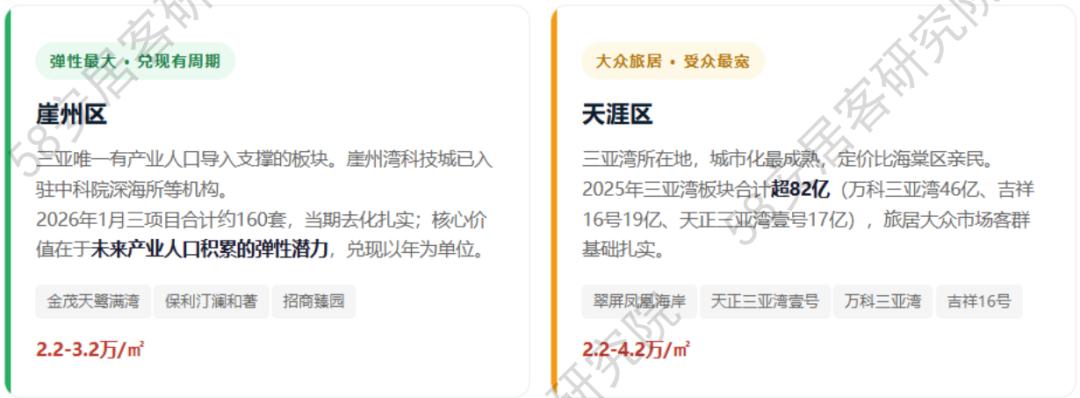 海棠区:三盘134亿+5.1万/㎡锚定,是价格发现的天花板;吉阳区:天珺三榜登顶日均3套,是稳定需求的压舱石;崖州区:产业人口逻辑清晰但兑现以年为单位,是弹性最大的变量;天涯区:三亚湾82亿证明大众旅居客群基础扎实,是受众最宽的蓄水池。四个板块互不抢客,共同构成三亚楼市的立体需求结构。