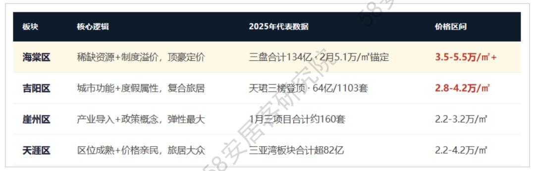 理解三亚楼市,不能只看全市均价。三亚下辖海棠区、吉阳区、天涯区、崖州区四个行政区,每个区资源禀赋不同,吸引的客群结构也完全不同。同一波封关行情,在不同板块上的落地方式,是一副比全市均价更有价值的市场结构图。