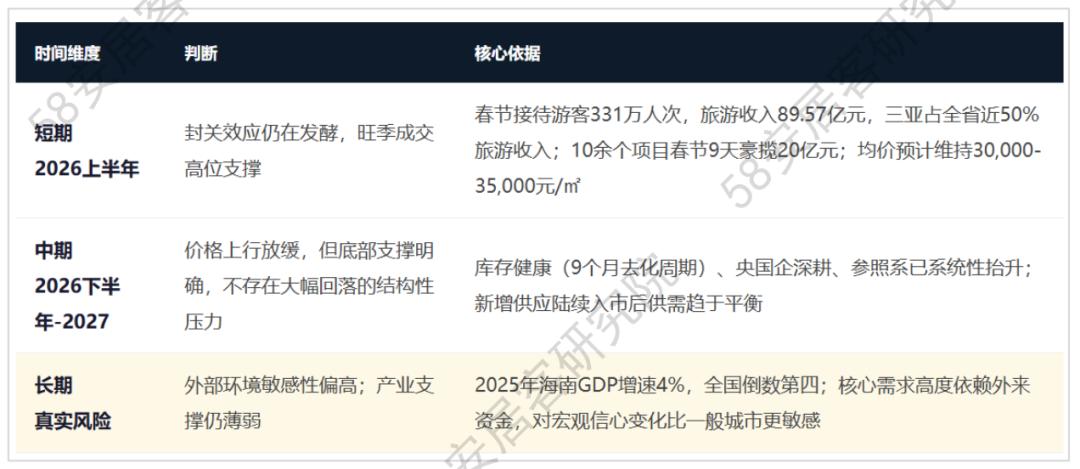 四个板块加在一起,构成的是一个互不竞争、各自锁客的立体结构:海棠锁顶豪,吉阳锁城居,崖州锁产业,天涯锁大众。这种结构的健康之处在于,任何单一板块的波动都不会引发系统性踩踏——每个板块服务的买家有自己的决策逻辑,不是同一批人在四个地方之间比价选择。这也是为什么三亚2026年1-2月量跌14%,四个板块均未出现价格崩塌:每个板块的买家撤退,不会带走其他板块的需求。