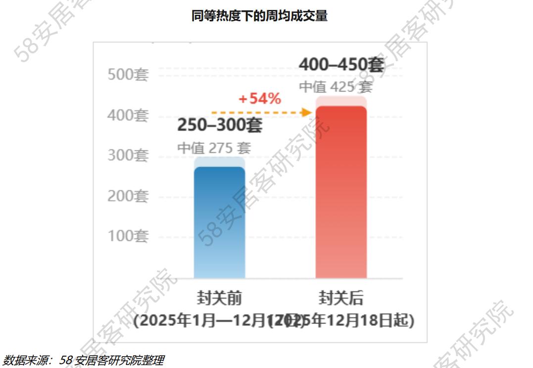 将热度指数与当周实际成交套数做配对比较:封关前热度在30-35区间时,周均成交约250-300套;封关后同等热度水平下,周均成交已升至约400-450套。