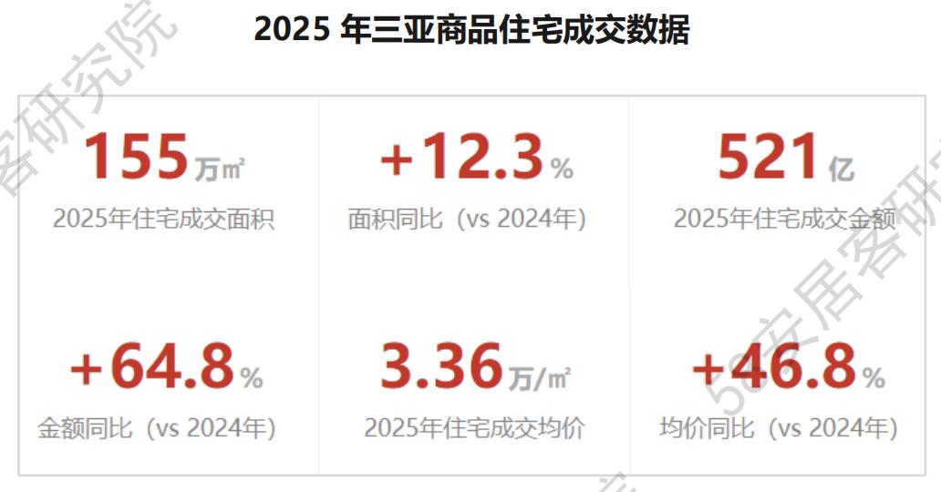 2025年,全国商品住宅销售面积同比下降 9.2 %,绝大多数城市量价承压。而三亚商品住宅成交面积约155万㎡,同比上涨12.3%;成交金额约521亿元,同比大涨+64.8%。