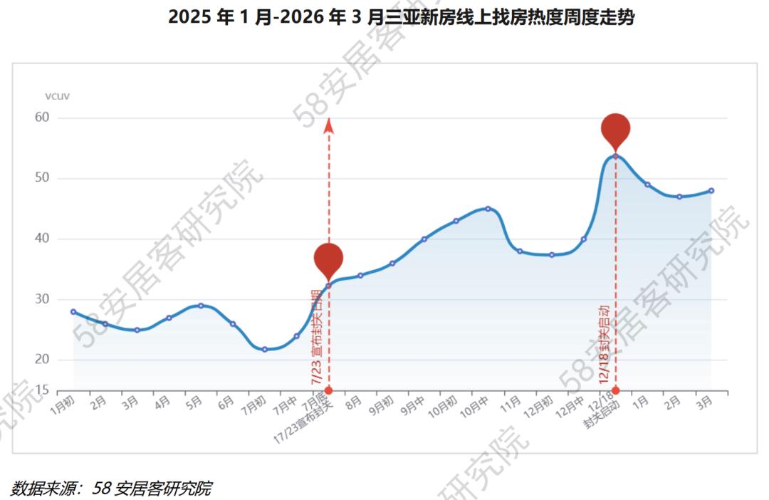 从58安居客周度找房热度数据来看,三亚新房市场的这一轮行情走势,与海南封关政策节点高度绑定,核心源于政策从“模糊预期”到“明确落地”的预期传导: