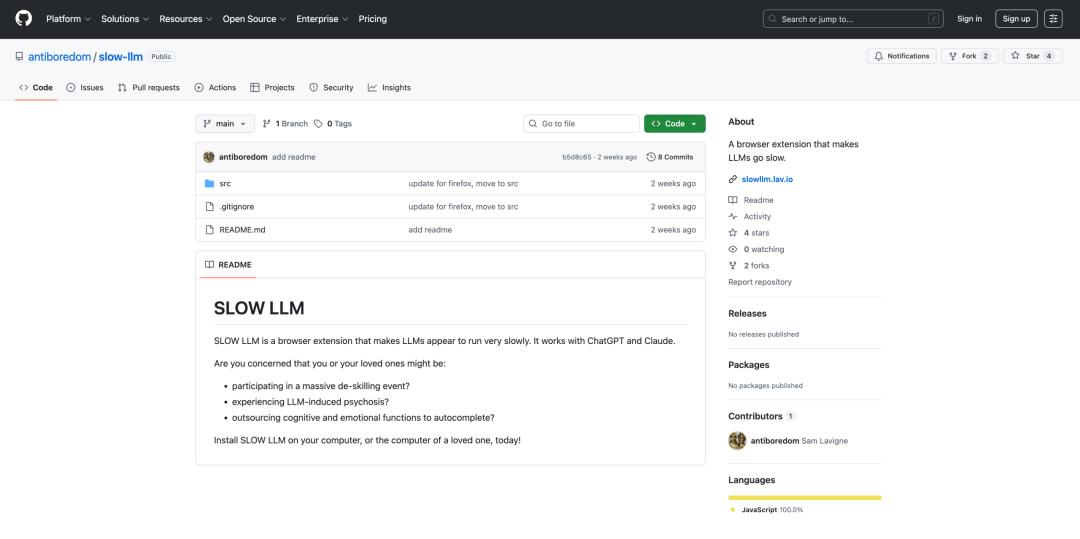 但相比于此前这些项目,Slow LLM 还有一个有趣的细节。Lavigne 在开发这个项目的时候,用的是 Claude。写了一部分代码之后,他把 Slow LLM 部署上去,Claude 开始变得极其缓慢,他才被迫靠自己把项目做完。