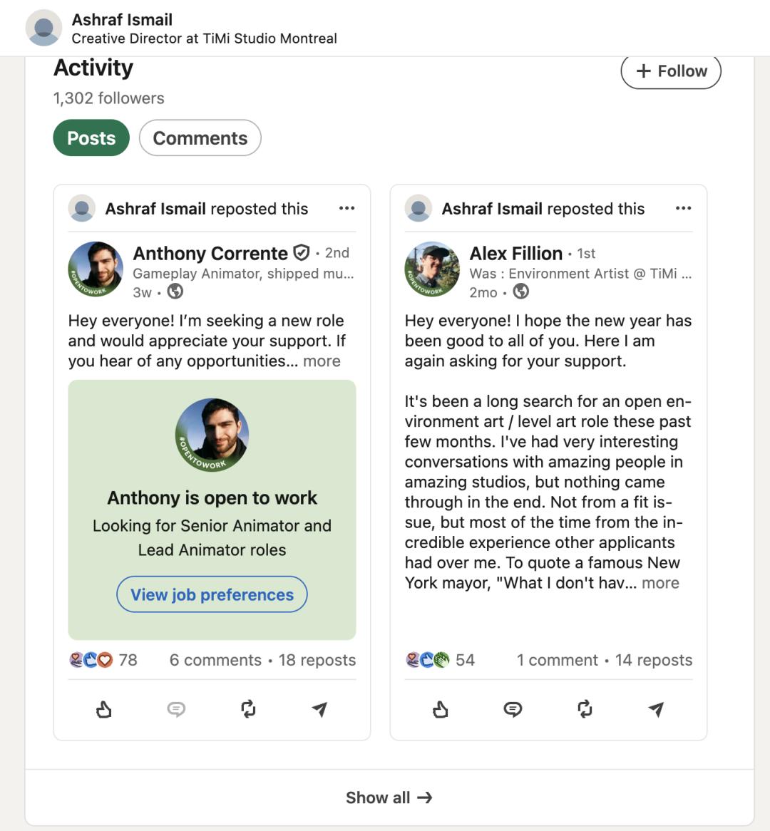 一位当时被裁的环境美术在LinkedIn上写道,那原本是他的“dream job”。裁员来得很突然,他说自己“还没从那种失落中缓过来”。三个月后,他再次发帖,称还在找工作。今年年初,他写道,自己聊了很多机会,但每一次都遇到了“非常优秀的竞争者”,始终没有拿到offer。这条动态后来甚至被伊斯梅尔转发。