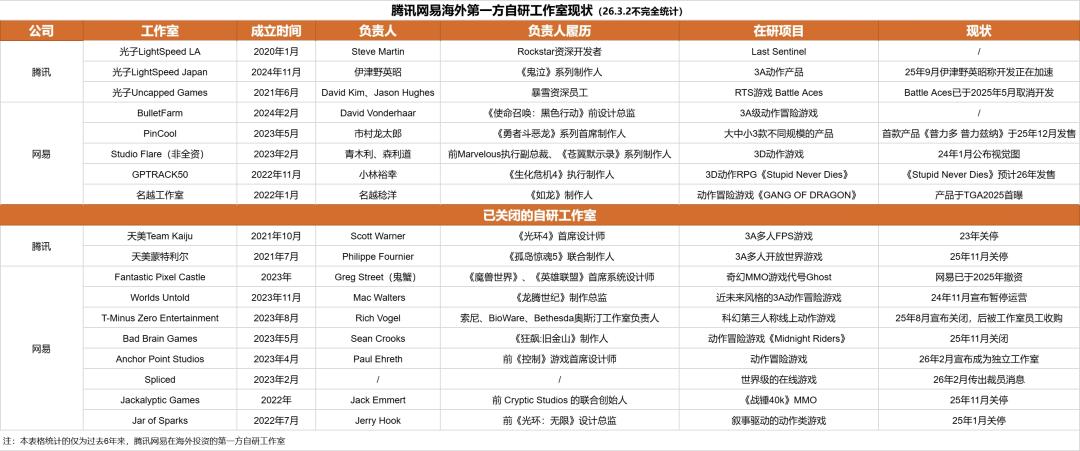 据竞核统计,自2020年起,中国头部厂商密集在海外布局AAA自研工作室,并在2023年前后达到高点;但仅仅两三年后,这一轮扩张迅速收缩:腾讯、网易合计的18家海外第一方工作室,如今仅剩约8家仍在运转。