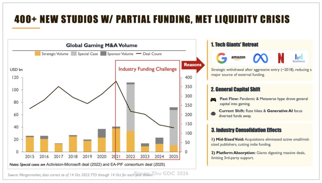在GDC 2026上,Simon Zhu(朱原,前网易游戏全球投资与合作总裁)将当前困境定义为一场B2B流动性危机:疫情期间行业一口气成立了300-400个工作室或项目,但只获得行业约20%的资金支持。而在2022年之后,随着利率上升、资本转向AI,以及并购整合加剧,这些项目开始集中出清。