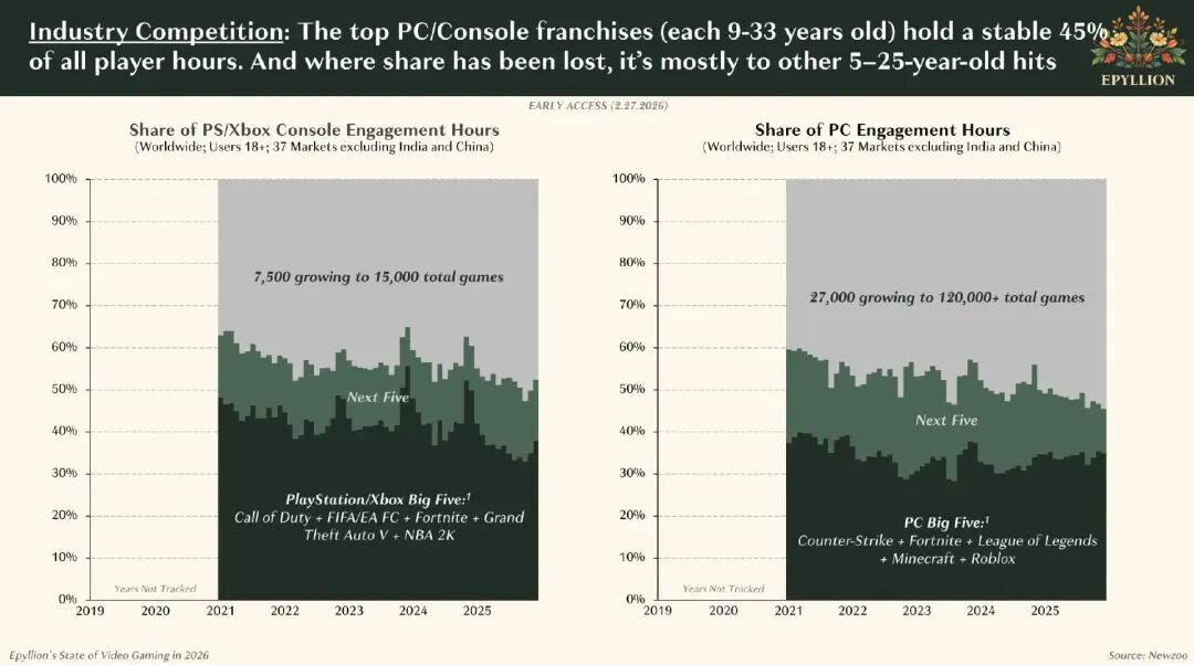 如果只看主机和PC端,这种挤压感更加直观:每年只有大约10款游戏就能吃掉一半玩家时间,而且这种情况年复一年。换句话说,对新项目来说,最大的敌人不是质量,而是“没有时间”。