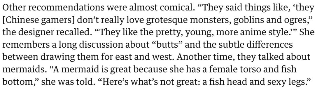 十多年前,当腾讯收购《英雄联盟》开发商Riot Games时,《卫报》曾报道,当时的设计师回忆,中国合作方曾提出这样的建议:“他们会说,‘中国玩家其实不太喜欢怪物、哥布林或食人魔这样的形象,他们更喜欢漂亮、年轻、偏动漫风格的角色。’”