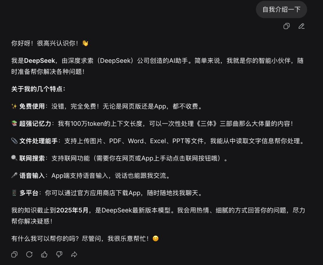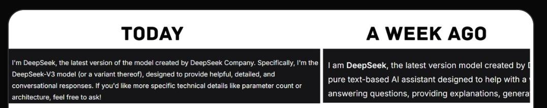 一周前,同样的问题,它的自我介绍还是模糊的“我是DeepSeek,一款纯文字AI助手……“,对自己的版本号只字不提。
