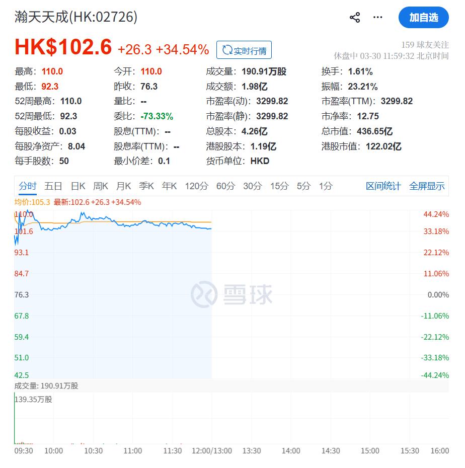 上市首日,瀚天天成高开高走,开盘价为110港元/股,截至午间休盘,瀚天天成股价报102.6港元/股,总市值436.65亿港元。