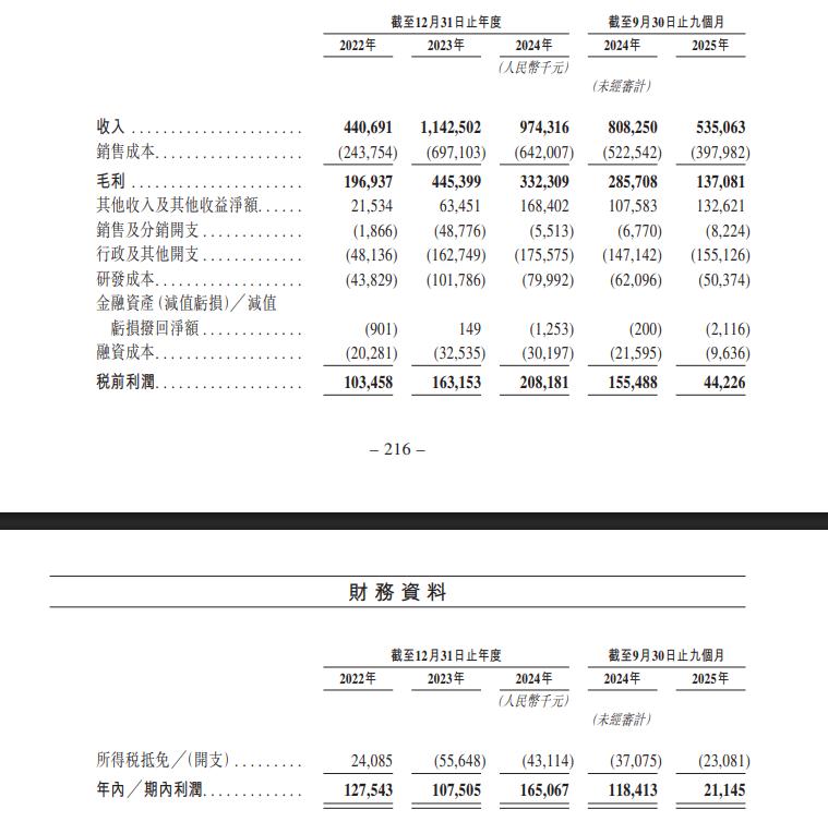 业绩方面,招股书显示,2022年、2023年、2024年及2025年前三季度,瀚天天成收入分别为4.41亿元、11.43亿元、9.74亿元及5.35亿元;净利润分别为1.28亿元、1.08亿元、1.65亿元及0.21亿元;毛利率分别为44.7%、39.0%、34.1%及25.6%。
