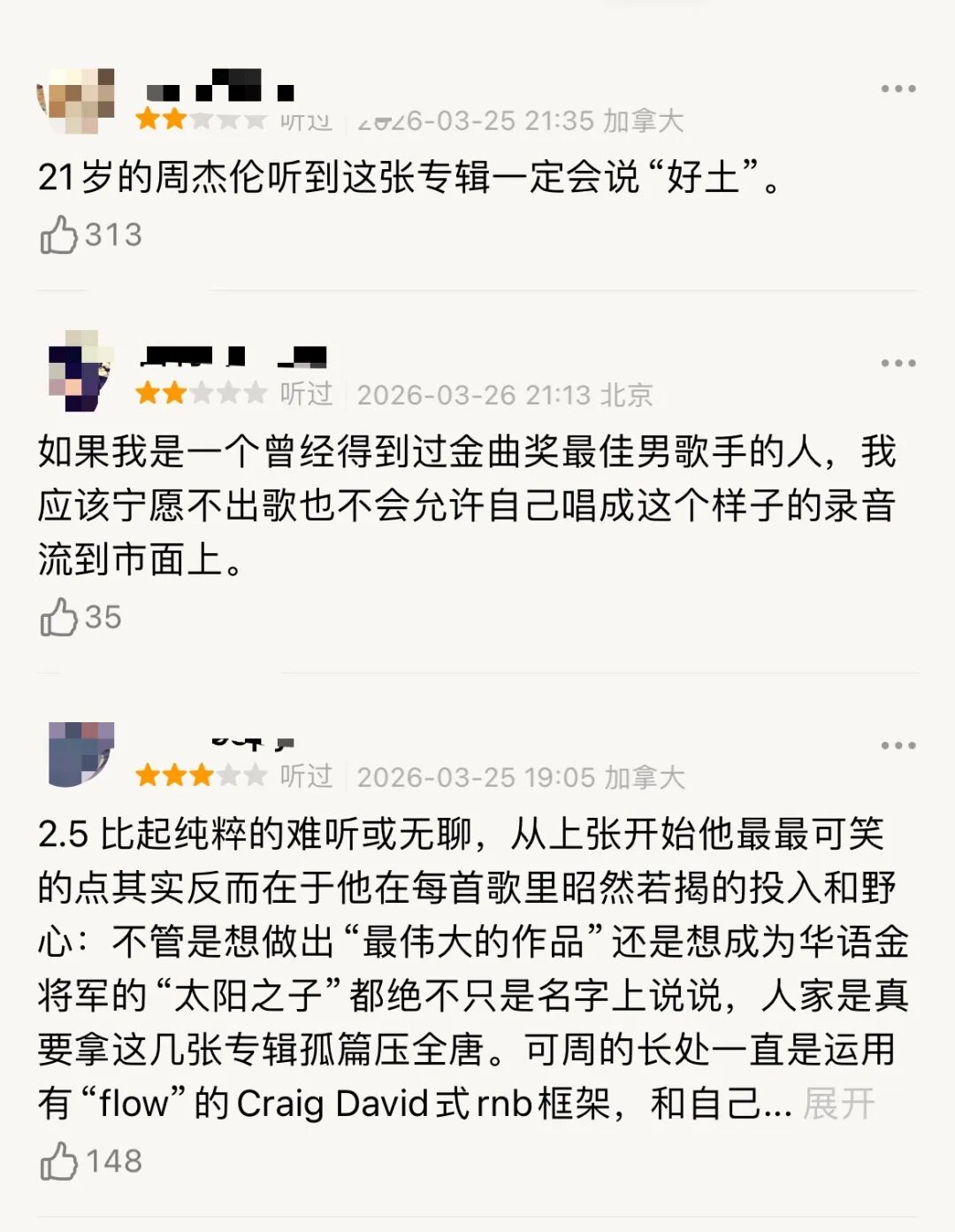 一位自称“十八年杰迷”的老粉写得更为坦诚:“坏消息:同质化严重。好消息:同质化自己。算是一张说得过去的专辑。毕竟超人飞了这么多年,也不能要求太多。他现在就是这个审美,一言难尽。”