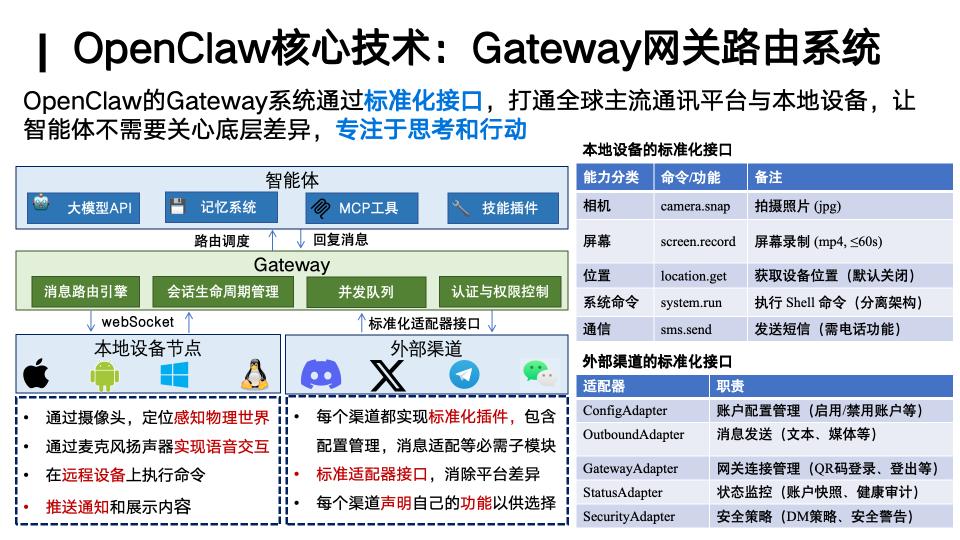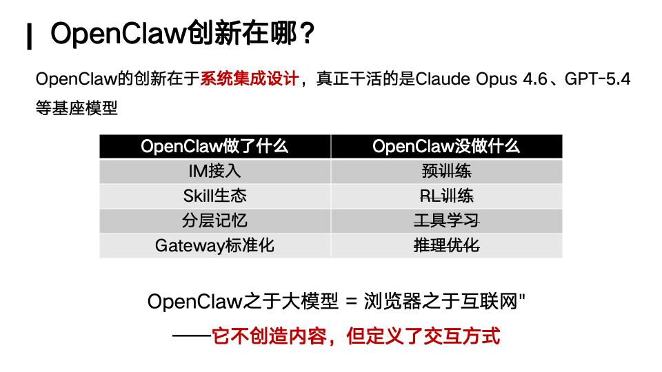 在这里我给大家一个暴论:从 AI、大模型技术创新的角度来看,OpenClaw 其实并没有太多的创新,是已有技术的使用,它不训练模型,不改进推理算法,也不做底层的工具学习。它所做的,是 IM 通讯平台的接入、本地部署架构、分层记忆以及 Gateway 的标准化 。这些都是非常优秀的软件工程设计,但在核心算法本质上并没有突破 。