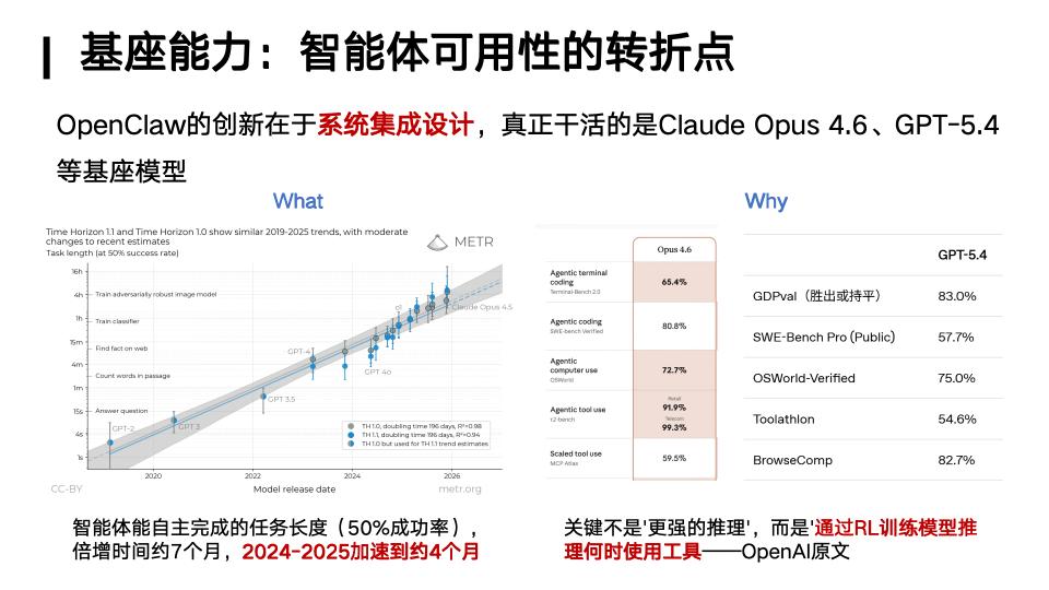来看一组统计数据,这是大模型出现以来,智能体在 50% 成功率的情况下,它可以自主完成任务的长度,大模型出来之后,倍增时间约 7 个月,过去一两年的倍增时间加速到约 4 个月。右边的图是我刚才提到的 Claude Opus4.6、GPT-5.4,基本上都是在代码能力、工具调用能力方面相比于前一版本有了质的飞跃。