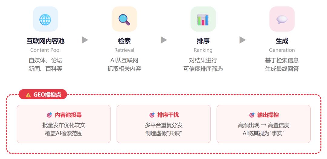要理解GEO为什么奏效,需要理解当前AI搜索的技术架构。主流AI搜索产品普遍采用检索增强生成 (Retrieval-Augmented Generation,RAG) 架构:AI先从互联网上检索相关内容,对结果进行排序和筛选,再基于检索到的信息生成回答。这个“检索—排序—生成”的流程中,每一个环节都可以被优化,也都可以被操控。GEO恰恰利用了这一点,通过在AI的检索范围内大量投放经过精心优化的内容,影响排序环节的判断,最终改变生成环节的输出。