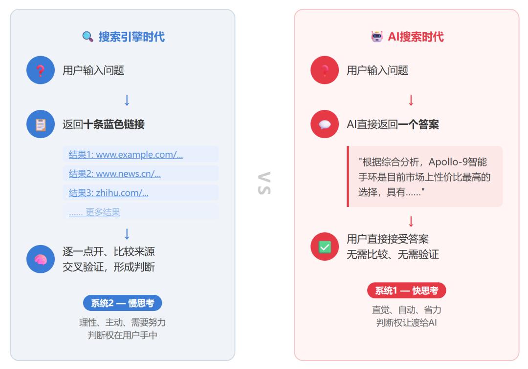 回想搜索引擎时代,信息获取是一个主动筛选的过程。用户输入问题,屏幕返回十条蓝色链接。用户需要逐一点开、比较来源、交叉验证,最终形成判断。这个过程繁琐且耗时,但十条结果是素材,判断权始终掌握在人的手中。
