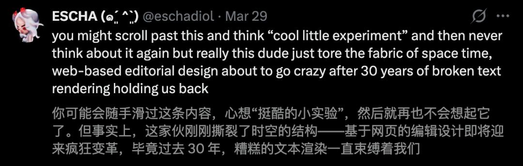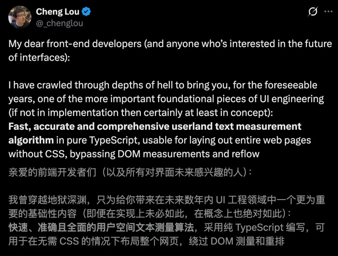 在Cheng Lou看来,Pretext不仅是一个底层UI工程的基石级突破,更是一次架构层面的范式转移。