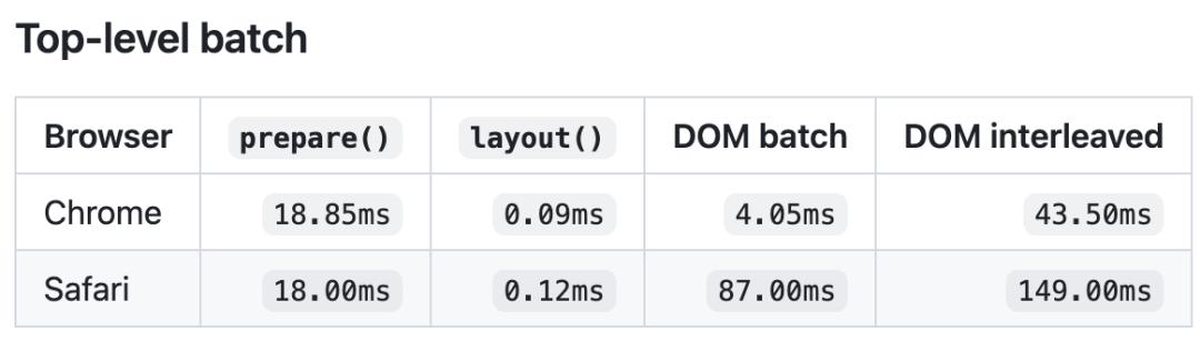 - Safari上更夸张,layout() 0.12毫秒,DOM交错测量149.00毫秒,快了超1242倍——整整三个数量级。