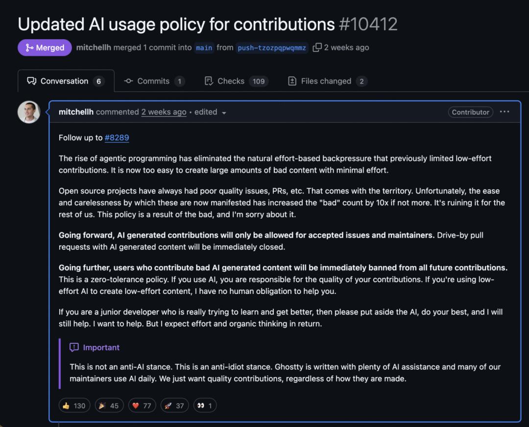 Hashimoto 对待 AI 贡献的方式也发生了变化。2025 年 8 月,他们开始 要求 强制披露。“如果你使用了** 任何形式的 AI 辅助** 来为 Ghostty 做贡献,就必须在拉取请求中进行说明。”但到 2026 年 1 月底,他采取了零容忍态度。AI 生成的贡献仅限于已经接受的问题和维护者。Hashimoto 澄清说: