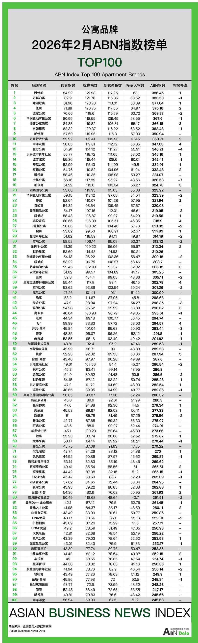 综述|2026年2月,公寓市场的搜索指数和新媒体指数稳中略降,监测均分分别达到56.24、86.12。
