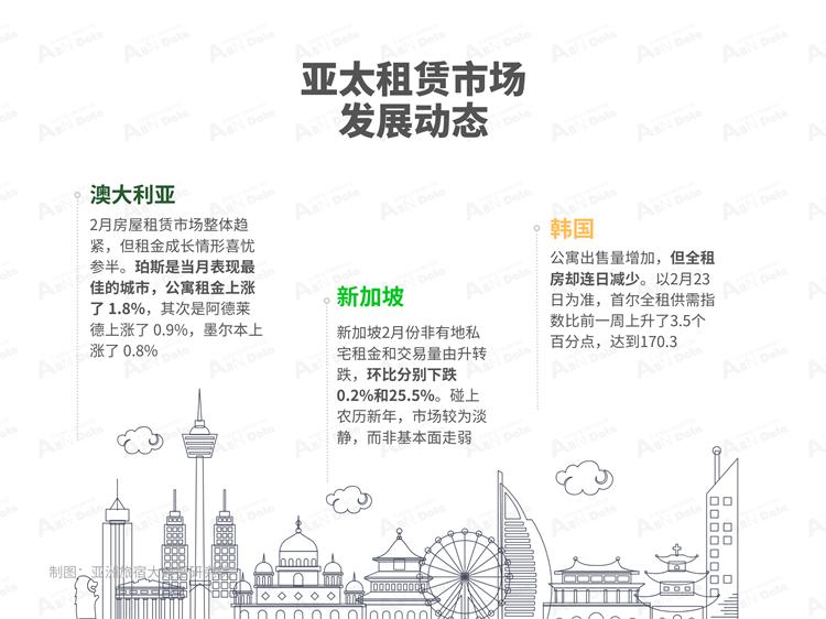 新加坡方面, 新加坡2月份非有地私宅租金和交易量由升转跌,环比分别下跌0.2%和25.5%。分析指出,租赁活动放缓主要是碰上农历新年,市场较为淡静,而非基本面走弱。