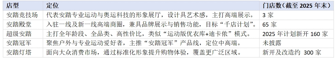 2025年,安踏主品牌也在渠道上进行了改革,根据不同消费人群布局了不同店型。其中有类似大卖场、覆盖全品类的“超级安踏”;聚焦专业运动与高端体验的“安踏竞技场”;定位高端商圈的“安踏殿堂”;面向大众消费市场的“安踏灯塔”。