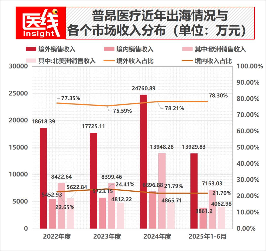 招股书显示,普昂医疗在2022年至2025年上半年,境外销售收入占主营业务收入的比例分别为77.35%、75.59%、78.21%和78.30%,常年逼近八成大关。
