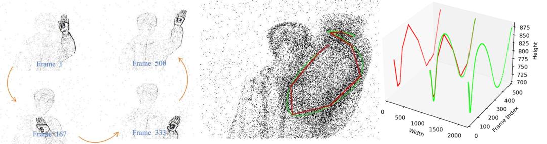 通过配套的自动化标注流水线(密度聚类、频率识别、噪声过滤),FlashCap能够直接从杂乱的事件流中精准解析出原生的1000Hz人体2D姿态标签 。 无需十万美元的设备,无需强环境光照,更没有巨大的数据存储压力,高精度、低成本的1000Hz的真值数据就此制作完毕。
