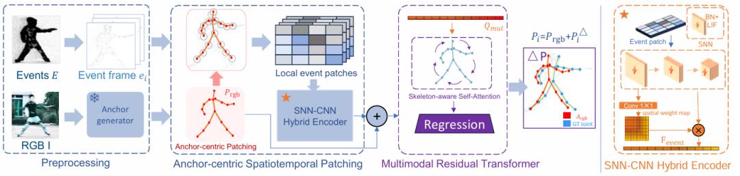 - Event分支(残差): 引入混合SNN-CNN编码器专门处理高频事件流。模型会在 RGB 锚点周围进行局部截取,精准捕捉微秒级的运动残差。